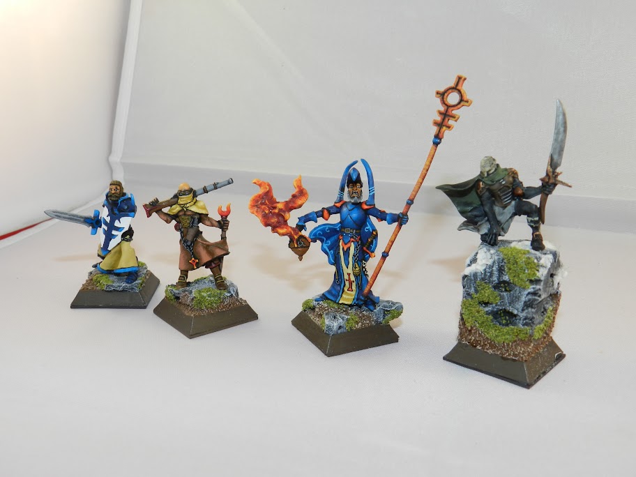 donc voici le début de ma bande avec le magicien, le voleur, un templier et le fusilier ( jouer en arbalétrier) que des figurines de chez Rackham, et quelques tests de décors
